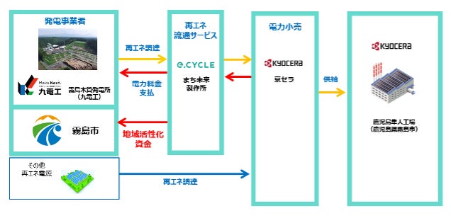 本スキームでは、京セラがまち未来製作所のe.CYCLE※を活用し調達した、九電工の霧島木質発電所の再エネを、京セラ隼人工場へ供給します。その調達金の一部を地域活性化資金としてまち未来製作所から霧島市へ寄付することで、再エネの地産地消を進めると同時に地域社会と発電所の共存を図り、持続可能なまちづくりに貢献します。