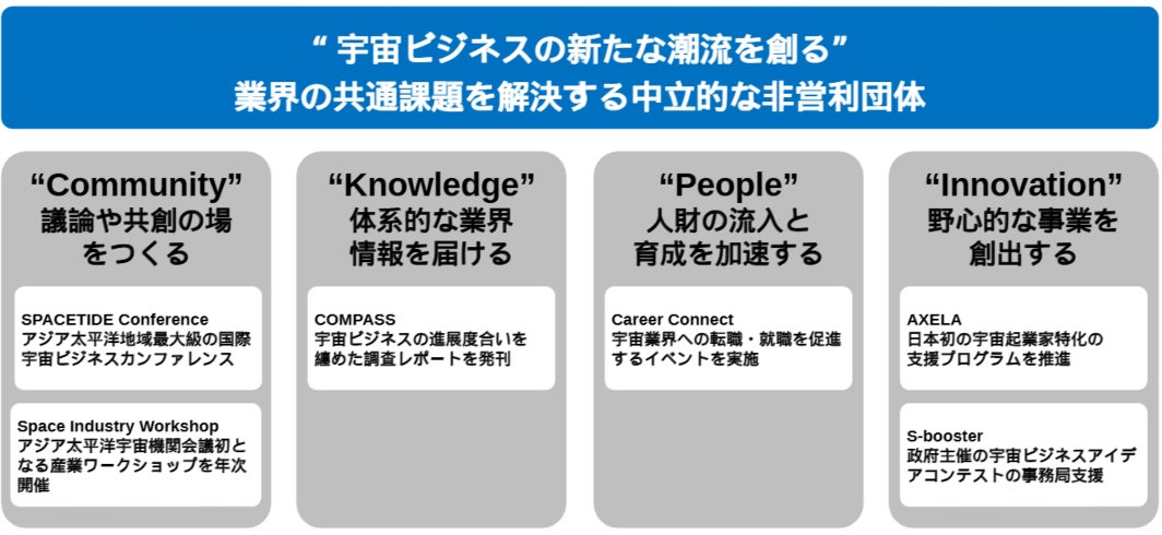 一般社団法人SPACETIDEは、2015年から「日本および世界の新たな宇宙産業の発展」をビジョンに掲げ、産業横断的な取り組みを通じて宇宙ビジネス全体の底上げを図り、新たな宇宙ビジネスの道筋を創り出すために活動している団体です。2015年から毎年、日本発の国際宇宙ビジネスカンファレンス「SPACETIDE」を主催しています。
