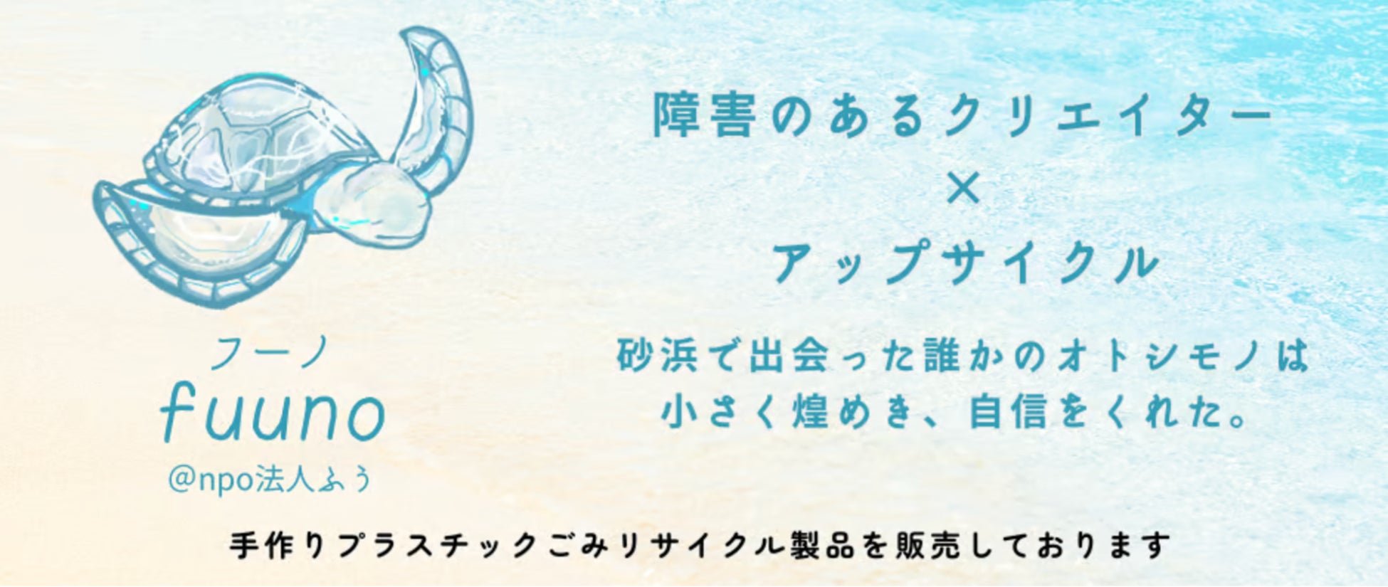 fuunoでは、さまざまな障害のあるクリエイターたちが自立した生活を目指しながら活動の一環としてアップサイクルに取り組んでいます。fuunoの製品はプラスチックごみが主な材料です。材料集めから洗浄、色分け、破砕、成形、仕上げ、ラッピングまで、特性に合わせて作業を分担しながら製作しています。