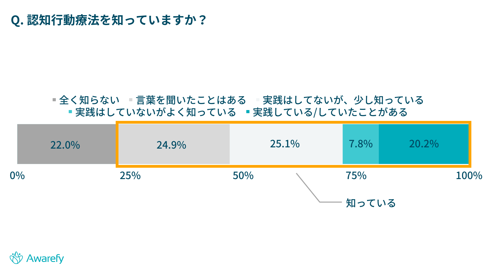 認知行動療法に関する調査。精神疾患経験者の認知度は78%。一方、その実施率は25%に留まる結果に。