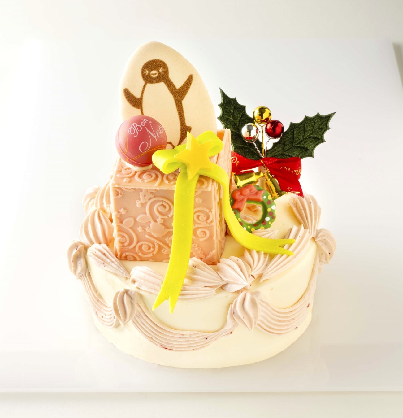 プレゼントBOXからSuicaのペンギンが飛び出てきたコロンバン伝統のバタークリームケーキ。