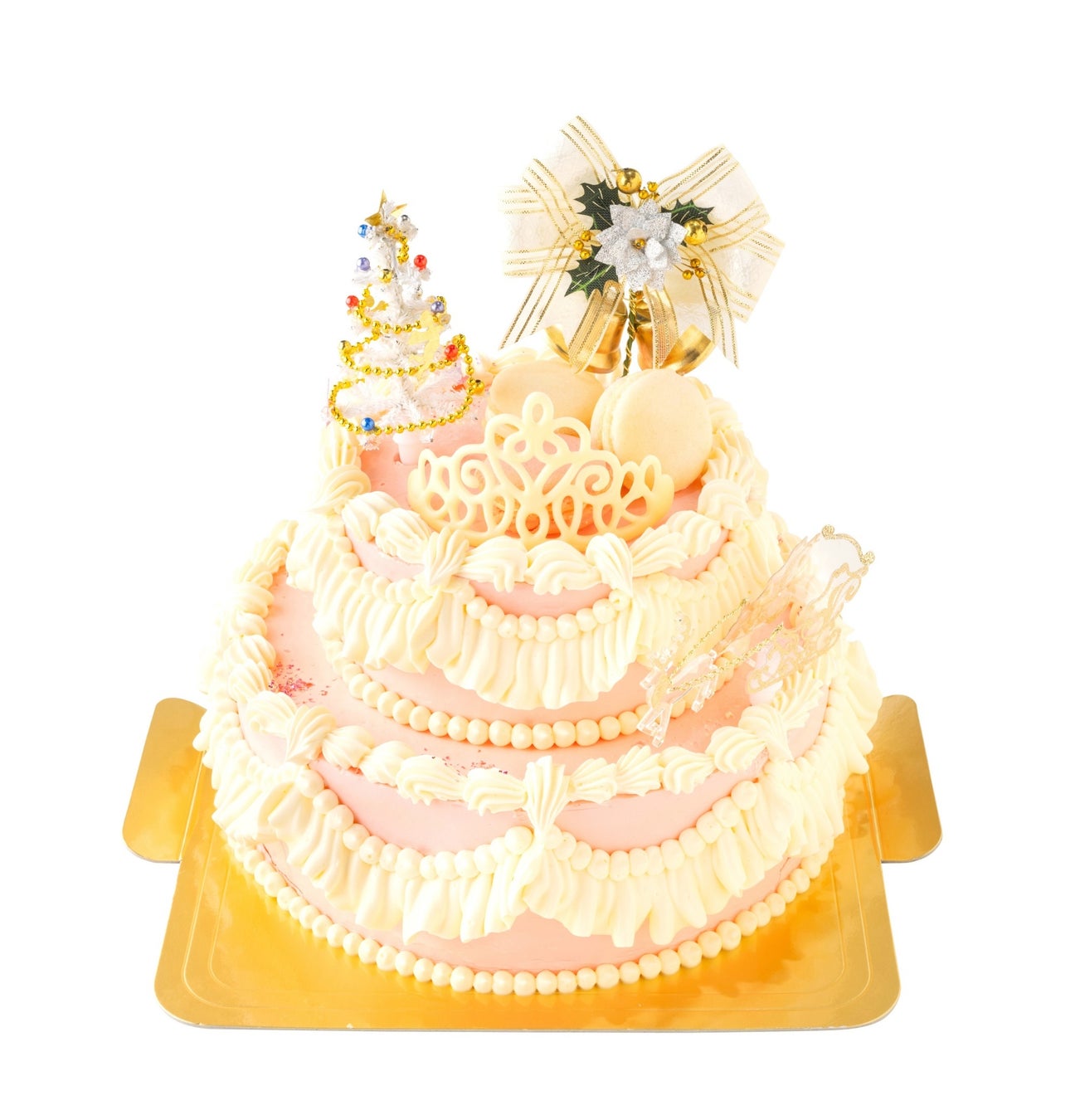 飴細工のティアラが輝く、華やかなスペシャルデコレーション。卵をたっぷり使用したしっとり食感のスポンジ生地に、香り高く濃厚なバタークリームとピンク色のクリームで包まれた高貴で優雅な雰囲気漂うケーキです。バタークリームはラム酒の有無が選べます。