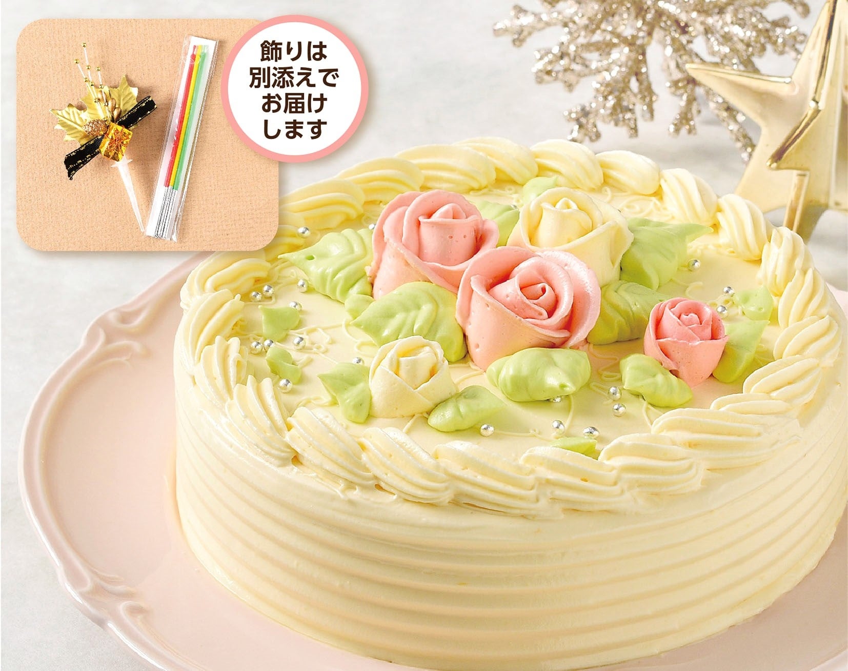 レシピ、製法、仕上げにわたり、代々受け継がれる、こだわりのバタークリームを使用したデコレーションケーキです。風味豊かでなめらかな口どけのバタークリームと、しっとり生地とのバランスを大切にした、いつまでも変わらぬ伝統の味をお楽しみください。薔薇をあしらい華やかに仕上げたオンラインショップ限定商品です。