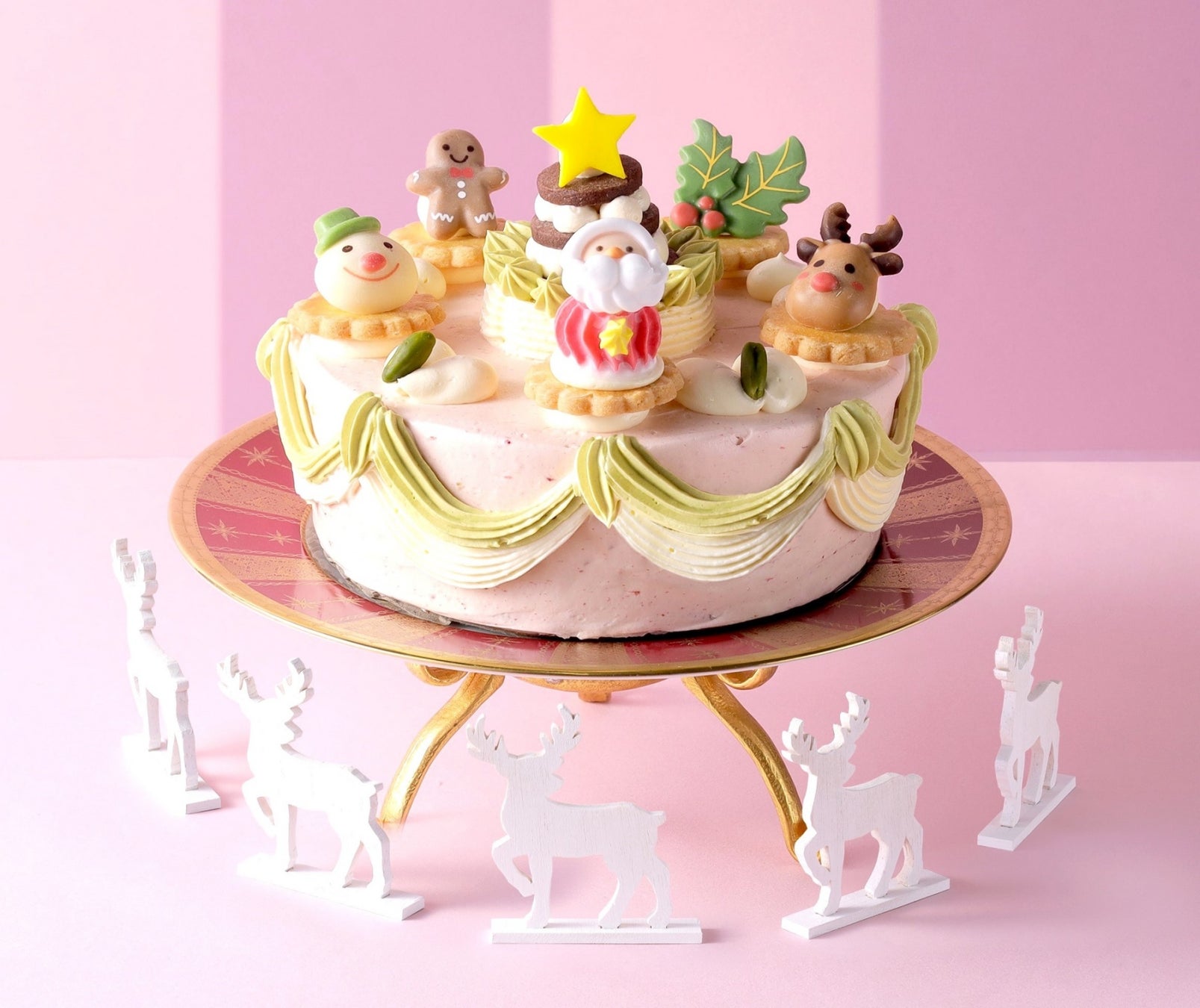 メリーゴーランドに見立てたいちご風味のバタークリームケーキの上で、サンタと仲間たちが楽しそうに遊んでいます。周りに絞ったピスタチオ風味のバタークリームがアクセントです。