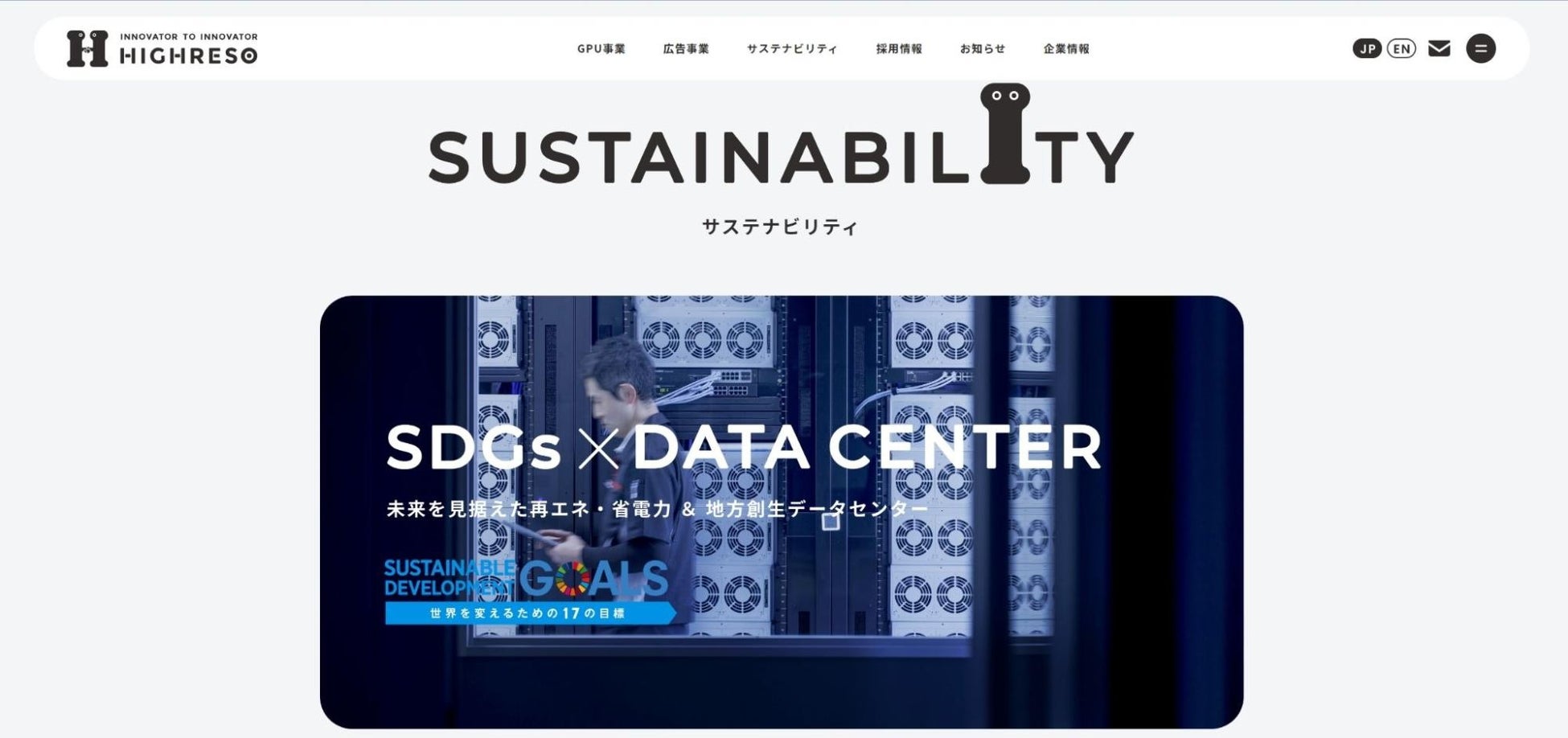 今回のコーポレートサイトリニューアルでは、GPU事業をはじめとした当社の主要サービスをよりわかりやすくお伝えできるよう、事業の特徴や導入実績などを多数掲載しています。また、新たに採用情報ページを設け、実際に働く社員のインタビューを掲載するなど、職場の雰囲気が伝わるサイトになりました。他にも、エアコンを使わないデータセンター運営など、当社が推進するSDGsの取り組みもご紹介しています。