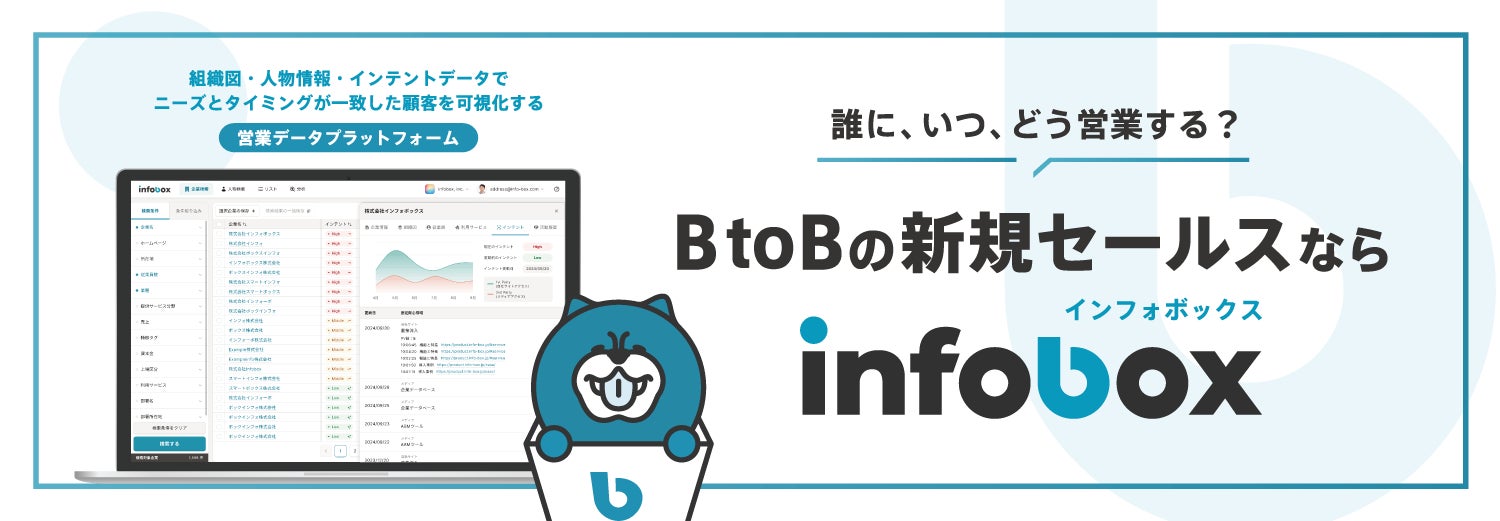 私たちは「ALL-WINNERな世界へ。」をビジョンに掲げ、買い手・売り手双方にとってより良い購買環境を実現するスタートアップです。市場リサーチ・企業リスト作成・決裁者アプローチを一気通貫で実現する営業データプラットフォーム「infobox」を開発・提供しています。
