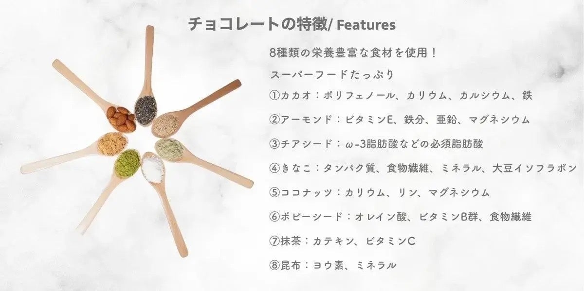 チョコレートの原料のカカオ豆に加え、アーモンド、きなこ、チアシード、ココナツ、ケシの実、抹茶、昆布などの栄養たっぷりの食材をふんだんに使用し、栄養価を最大まで高めた完全食チョコレート。