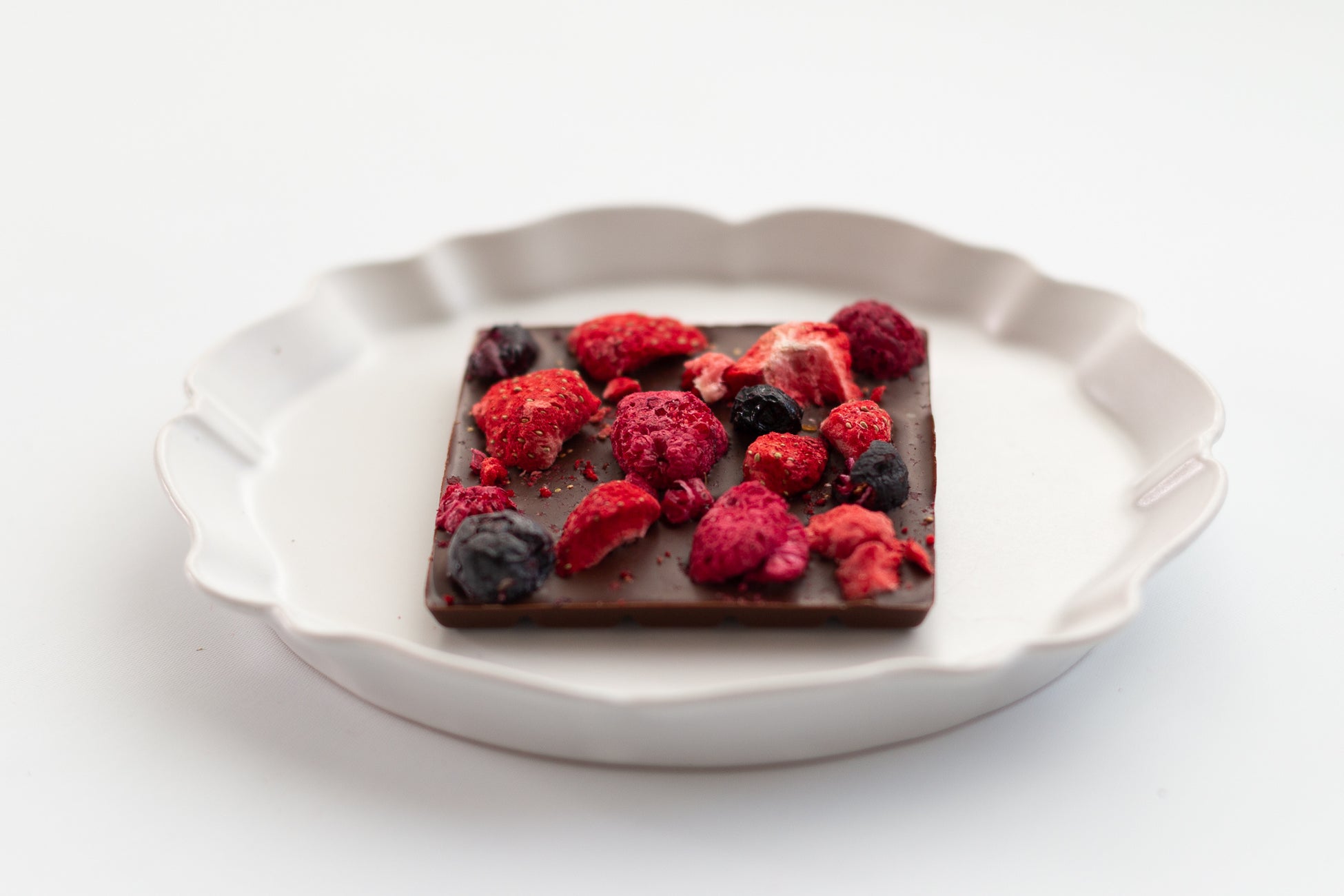 口に運ぶと感じるのはまずベリーの豊かな香り。チョコレートのまろやかな甘みと溶け合うひとときをこのタブレットでお届けしています。
