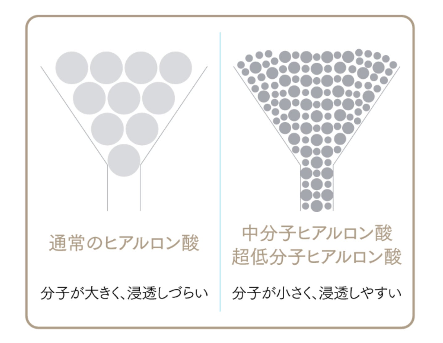 のむピュアHA4はとにかく分子の大きさにこだわりました!一般的な高分子ヒアルロン酸と比較して分子が非常に小さく体内への吸収率が高いと言われている2種類のヒアルロン酸を採用。