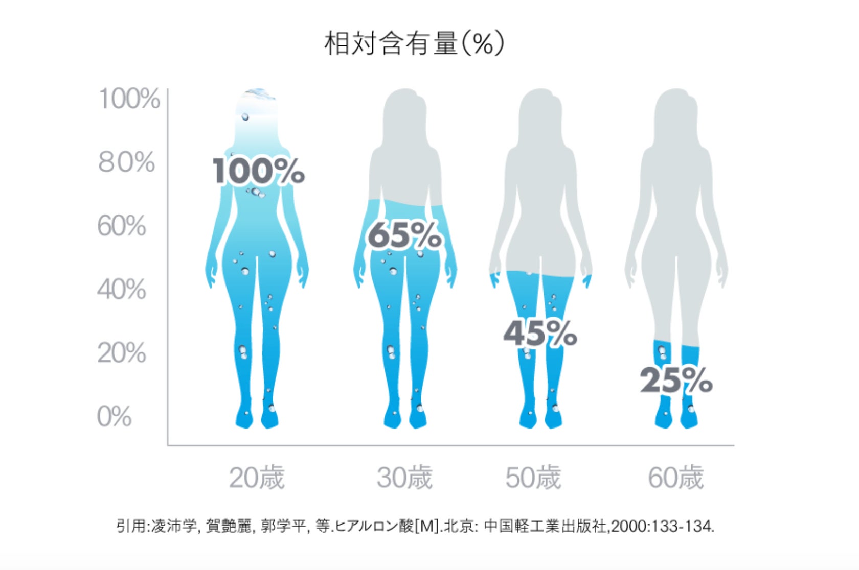 ヒアルロン酸は、私たちの体内のいたるところに存在しています。ヒアルロン酸の特徴はその驚くべき保水力!ヒアルロン酸1gで6Lもの水分を抱え込むことができると言われています。しかし、体内のヒアルロン酸量は年々減少しています。20代から減少し60才になると体内ヒアルロン酸の相対含有量は1/4に...