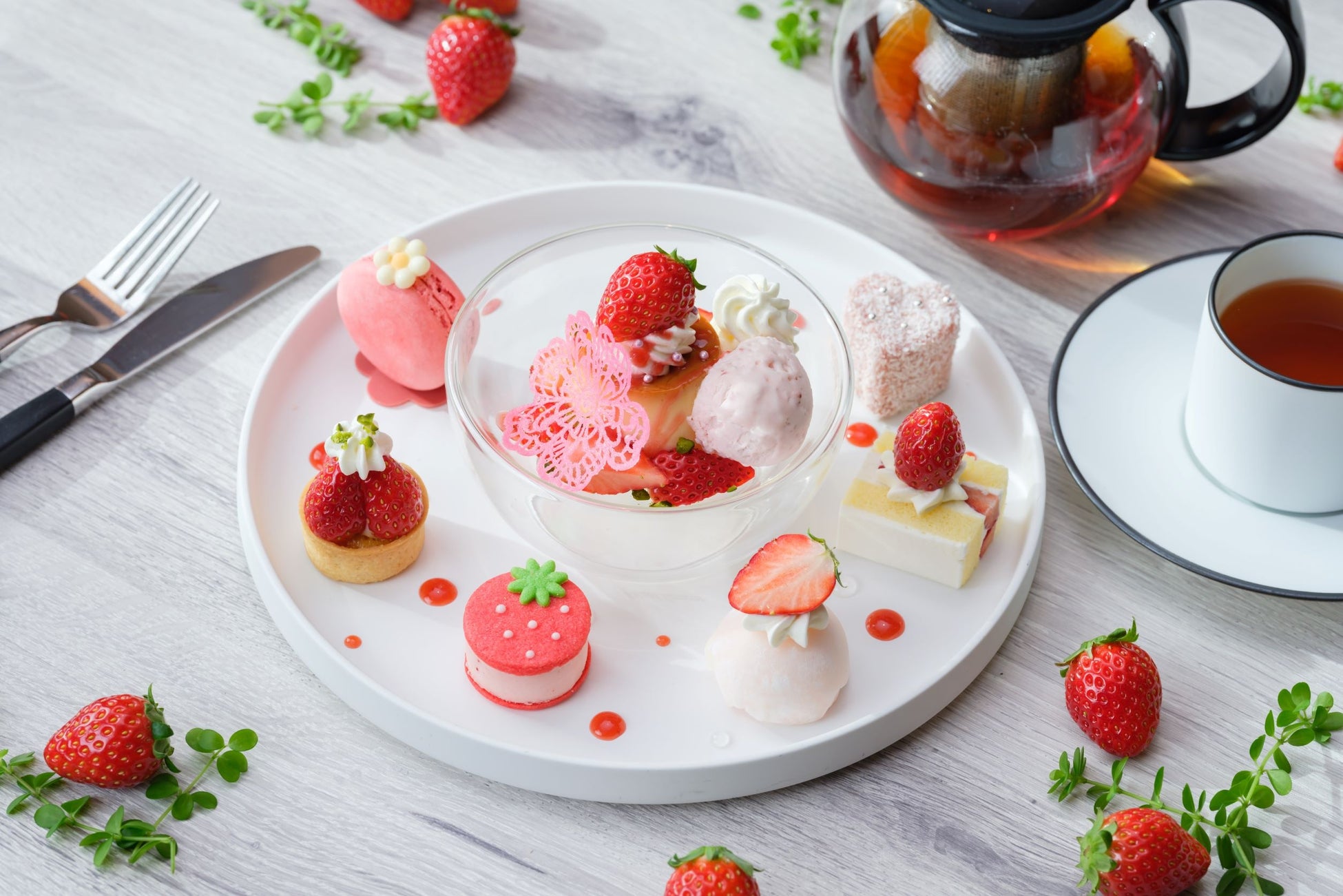赤とピンクを基調とした苺尽くしの可愛らしいケーキセットをご用意いたします。プリン・ア・ラ・モードは、苺アイスクリームやフレッシュな苺でデコレーションし、華やかに仕上げました。オーストラリア発祥の伝統菓子であるココナッツをまぶしたラミントンは、しっとりとしたジェノワーズに甘酸っぱい苺のチョコレートを染み込ませ、多様な味わいをお楽しみいただけます。ショートケーキは、口どけの良い甘さ控えめの生クリームと甘酸っぱい苺の相性が抜群。求肥のパルフェ包みは、苺の果肉入りパルフェをもちもちの求肥で包み、アイスサンドクッキーは、苺のアイスクリームを可愛らしい苺に見立てたクッキーでサンドしました。アーモンド生地を入れて焼き上げた香り豊かなタルトレットは、たっぷりのカスタードクリームと苺をトッピング。