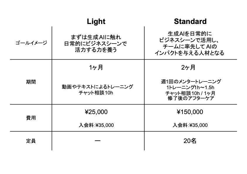 あなたの創造性やビジネスセンスを最大限に活かすために、生成 AI を活用する力を鍛え、あなたを生成 AI の専門家として社会に圧倒的なインパクト与える人材にするパーソナルジムの誕生です。