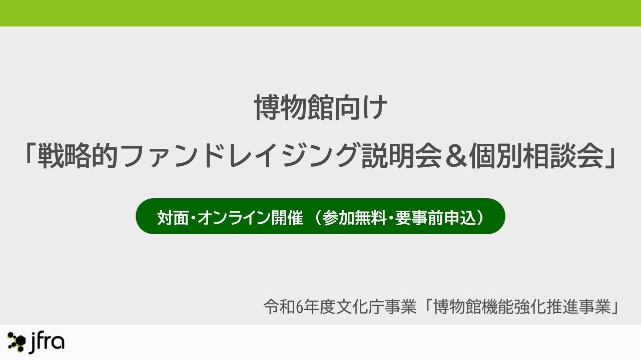 日本ファンドレイジング協会は、文化庁による委託事業(令和6年度「博物館機能強化推進事業」)に基づき、博物館(美術館・資料館等も含む)の職員及び関係者、博物館の設置主体・運営主体の職員及び関係者の方々を主な対象として、説明会「博物館向け・戦略的ファンドレイジング基礎と実践」を開催し、ファンドレイジングの基礎から応用にいたる具体的なアプローチや事例をご紹介します。その後の個別相談会では、参加者自身が直面するファンドレイジング上の課題や悩み、質問に、認定ファンドレイザーが個別に答えます。
