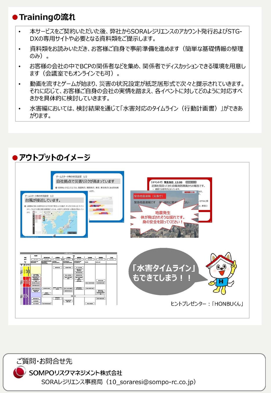 [*2] 災害対応ゲーム(STG)は、東京大学大学院廣井悠教授と当社の共同開発ツールである「帰宅困難者支援施設運営ゲーム(KUG)」等の図上演習ツールをヒントに、様々なケースでの災害対応をより身近に考えていただくことを目的に、SOMPOリスクが開発・提供するサービスです(参考 https://www.sompo-rc.co.jp/services/view/219)。