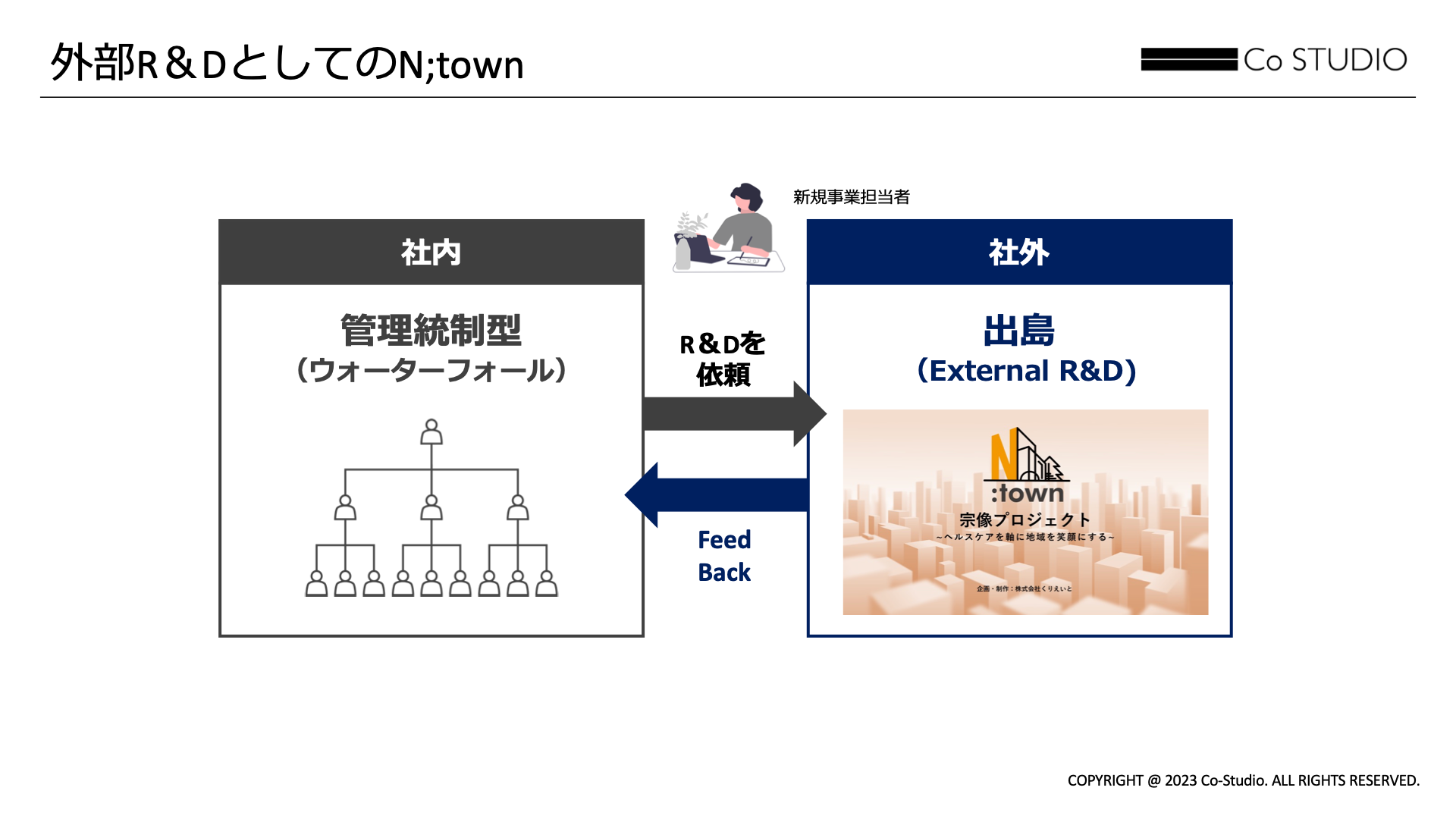 Co-Studioは「Social Good」をテーマに、社会をより良くする新規事業を、クライアント企業と共に創造するプロフェッショナル集団です。製薬やヘルスケア領域などの「人の健康」と、地域社会・コミュニティなどの「社会の健康」に取り組む企業内での新規事業開発に知見を有するとともに、正解のない新規事業開発に共にコミットし、イノベーションが起きづらい社内ではなく社外でR&Dを行う「DEZIMA」型での事業開発を中心に、アイデア創出から事業化まで常に伴走します。また、非営利団体や行政とも連動することで、営利と非営利の垣根を超えた事業創造を目指していきます。