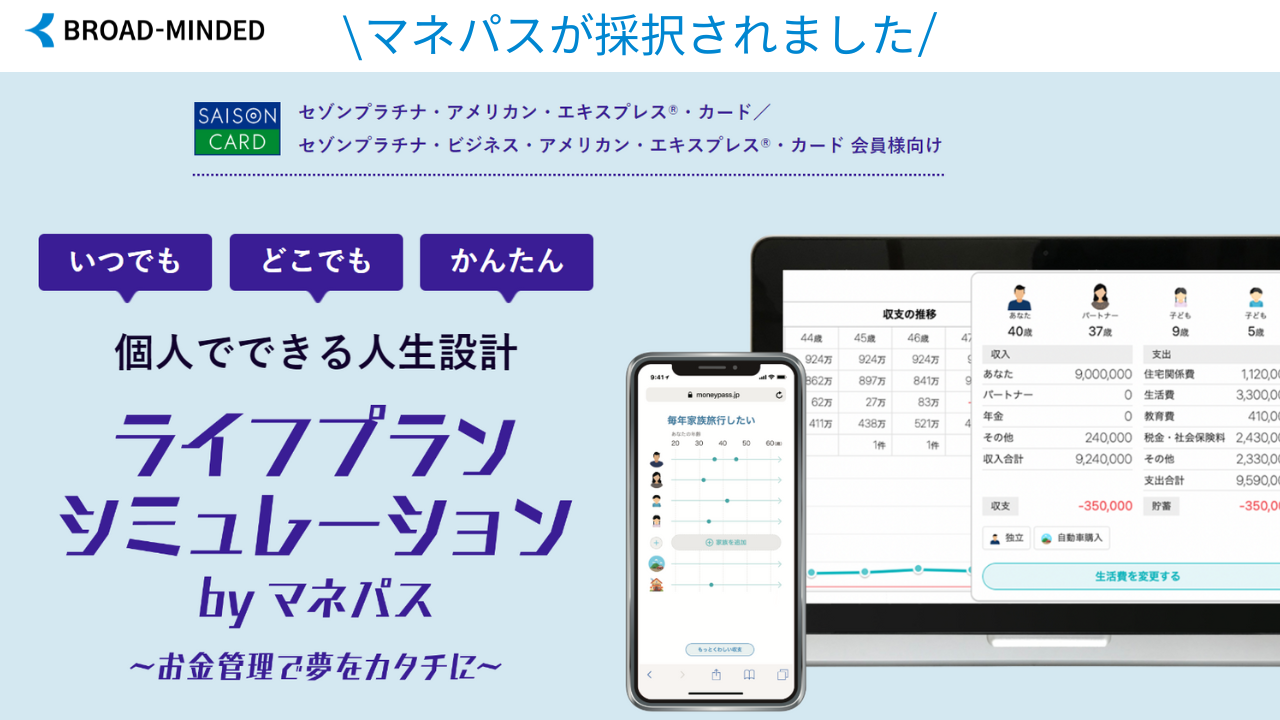 保険・証券・住宅ローンと複数の金融商品を横断して1社で取り扱うブロードマインド株式会社(本社:東京都渋谷区 代表取締役社長:伊藤清 証券コード:7343 以下:当社)は、株式会社クレディセゾン(本社:東京都豊島区、代表取締役(兼)社長執行役員COO:水野 克己、以下:クレディセゾン)が提供するセゾンプラチナ・アメリカン・エキスプレス🄬・カード、セゾンプラチナ・ビジネス・アメリカン・エキスプレス🄬・カードなどのプラチナ会員様へ向けて、当社のライフプランシミュレーションサービス「マネパス」を「ライフプランシミュレーションbyマネパス」として2022年7月より提供開始いたしました。