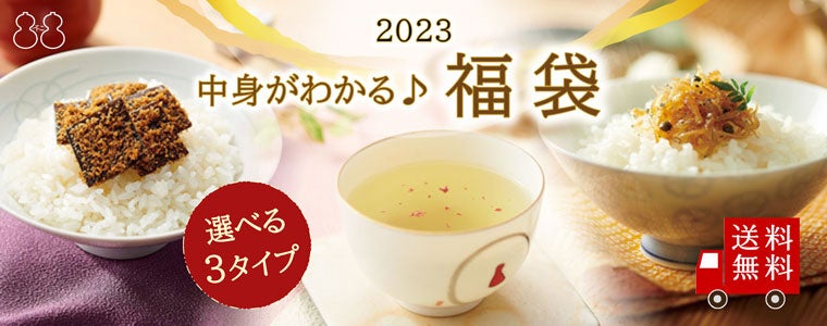 不二食品株式会社(本社:大阪市港区、代表取締役社長:藤井隆義)は、『不二食品公式オンラインショップ』と『こぶちゃ本舗』で2023年福袋の販売をスタートします。昆布茶やちりめん佃煮、くず湯、だし昆布、梅こぶ茶オリジナルグッズ(マスキングテープ・巾着・エコバッグ)などが入ったお得な詰合せを3種類ご用意いたしました。全国送料無料・数量限定!