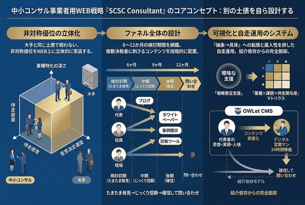 SCSC Consultantは、経営・財務・人事労務・技術・PRマーケティングの5コンサル業種を主軸に、3D-CMF理論・Athena AI・77's Check!!・SCSC Legal・OWLet CMS という5つのコア技術資産を統合し、「中小コンサル事業者の非対称優位をWEB上で立体的に可視化・伝達する」ことに特化したサービスです。