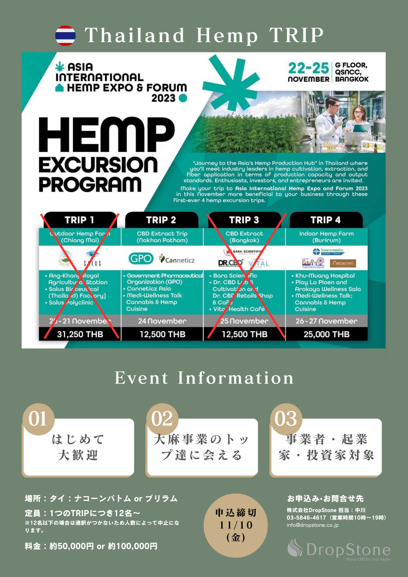 また、DropStoneは今月22日からタイ・バンコクで行われるASIA INTERNATIONAL HEMP EXPO&FORUM2023と同時期に開催されるタイでのヘンプ周遊ツアーに日本から参加される方の対応窓口を努めております。
