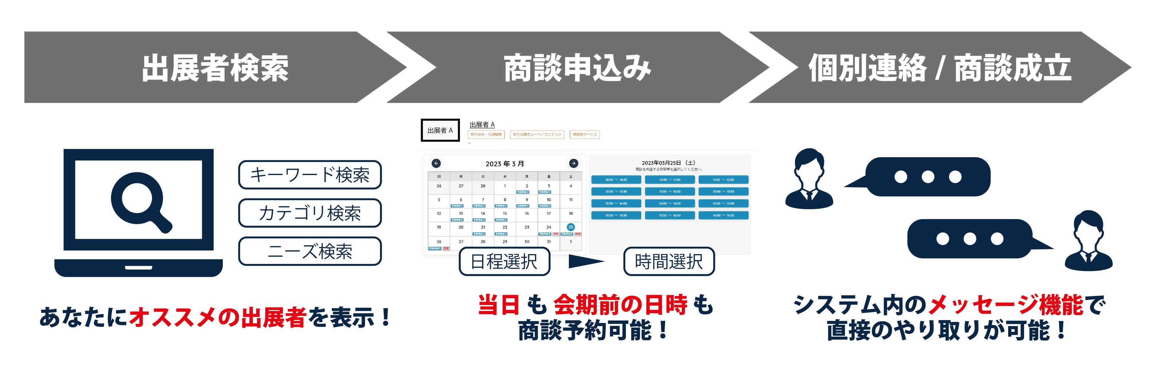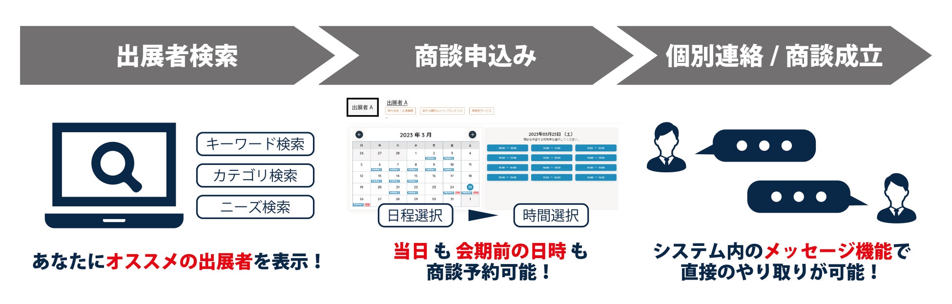 展示会当日はもちろん、WEB商談等を想定して 会期前の日程も商談予約が可能です。