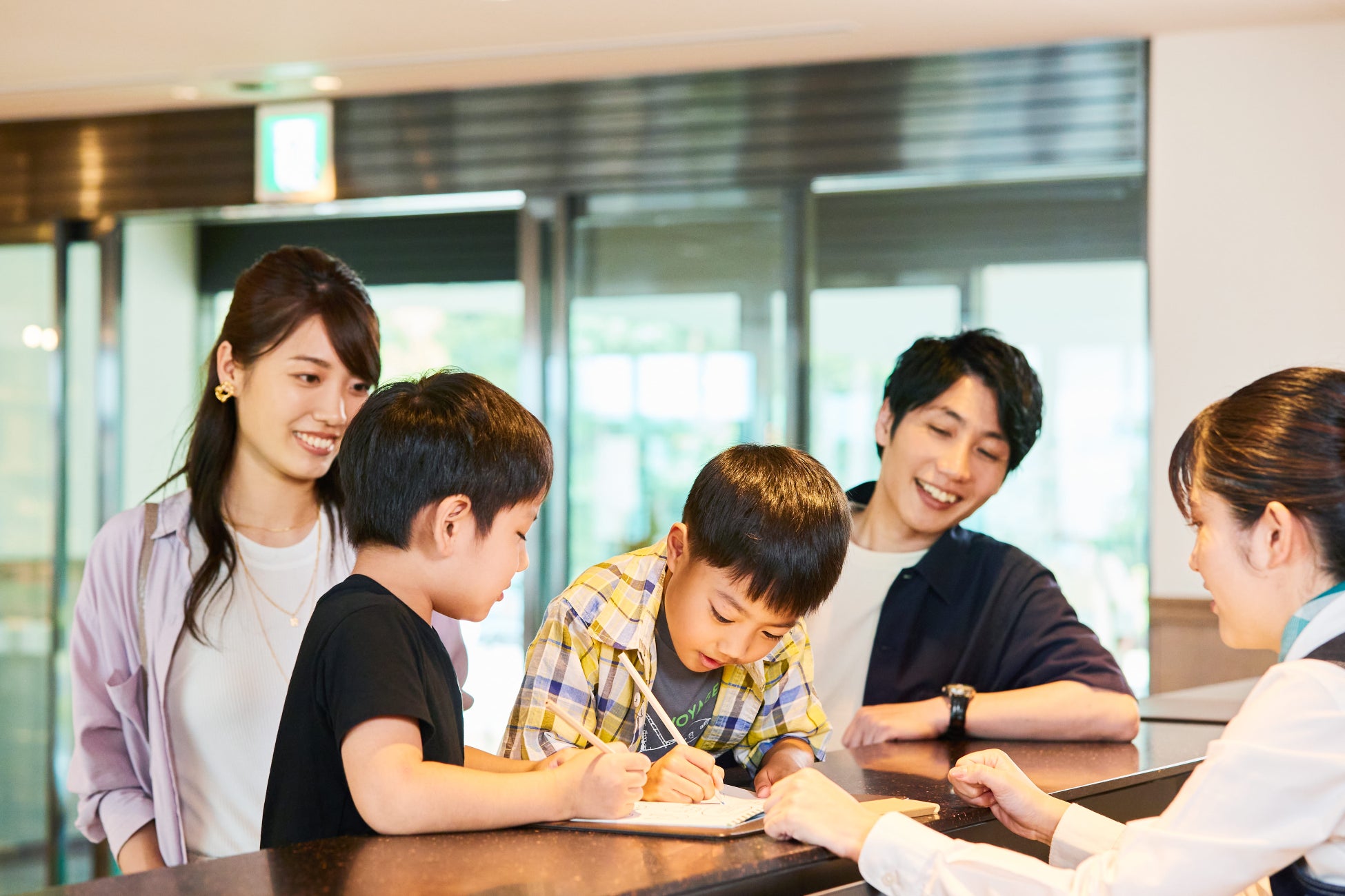 ホテルエントランスを入ったらまずはチェックイン。ANA ホリデイ・インリゾート信濃大町くろよんではお子様がホテルチェックインを体験できる「キッズチェックイン」をご用意しています。