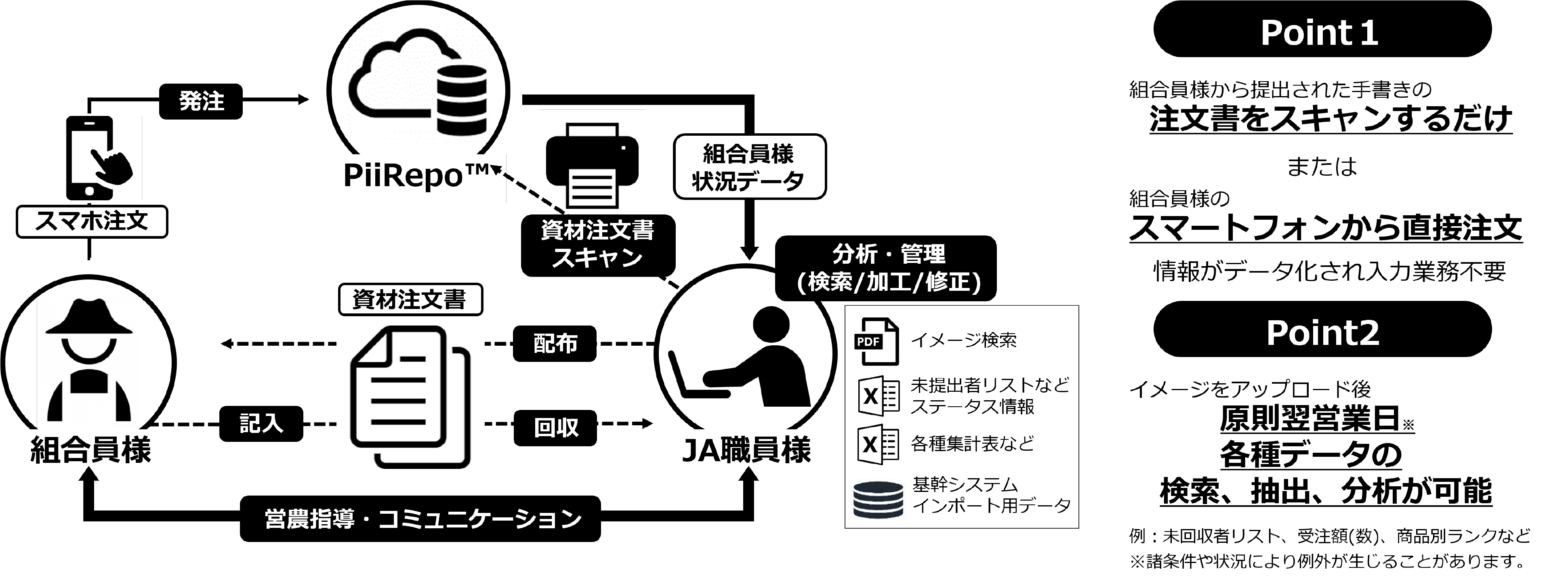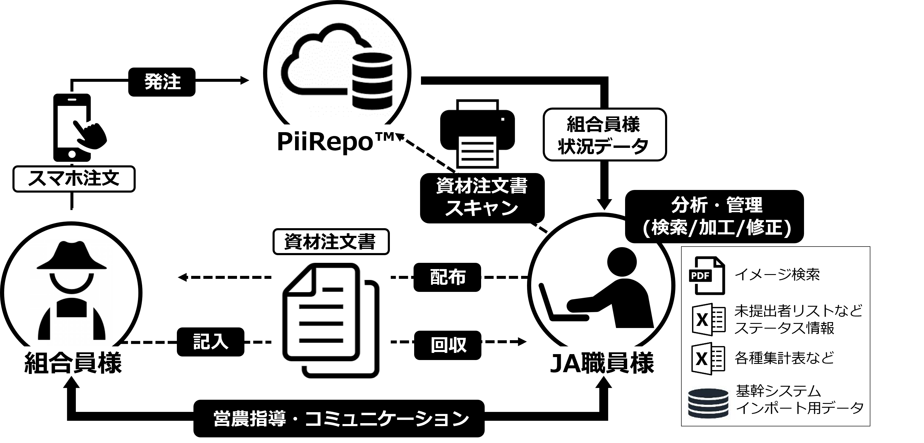 「PiiRepo™」は、JA様における「予約購買業務」の効率化と営農指導活動の支援をコンセプトとし、さらなる「出向く体制づくり」の構築を支援いたします。
