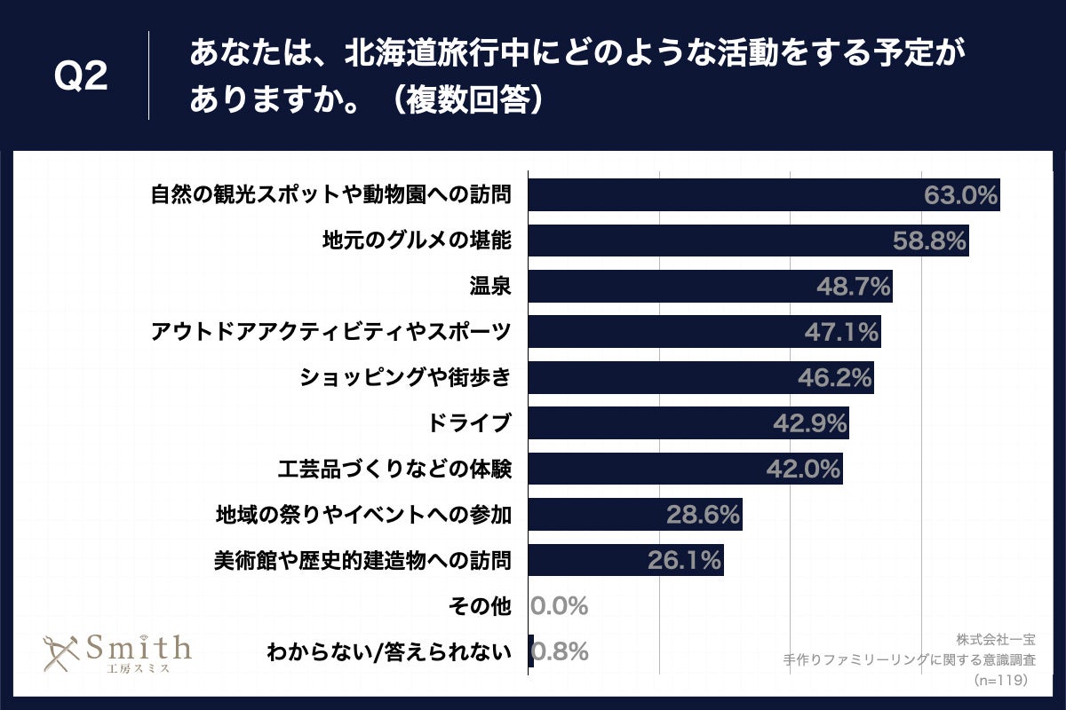「Q2.あなたは、北海道旅行中にどのような活動をする予定がありますか。(複数回答)」(n=119)と質問したところ、「自然の観光スポットや動物園への訪問」が63.0%、「地元のグルメの堪能」が58.8%、「温泉」が48.7%という回答となりました。