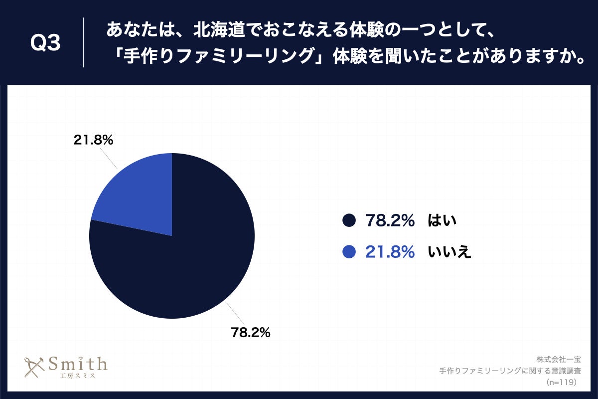 「Q3.あなたは、北海道でおこなえる体験の一つとして、「手作りファミリーリング」体験を聞いたことがありますか。」(n=119)と質問したところ、「はい」が78.2%という回答となりました。