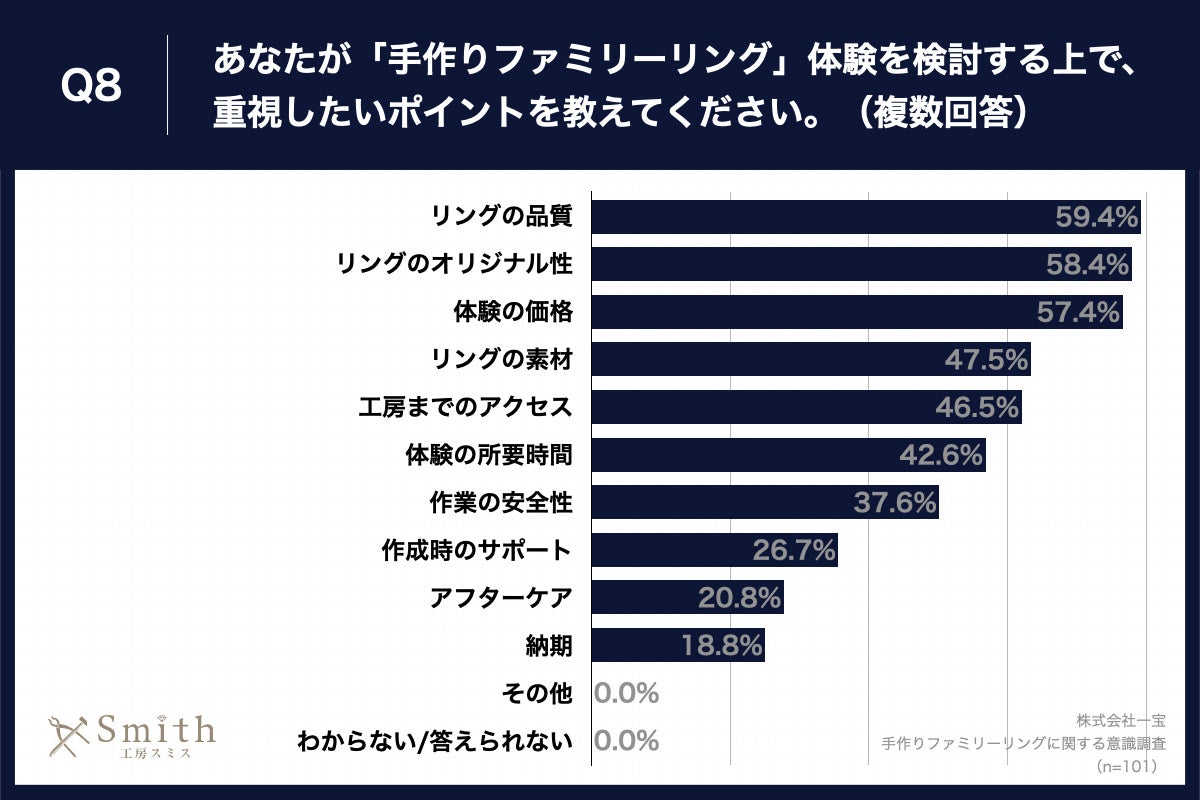 Q5で「とても興味がある」「やや興味がある」と回答した方に、「Q8.あなたが「手作りファミリーリング」体験を検討する上で、重視したいポイントを教えてください。(複数回答)」(n=101)と質問したところ、「リングの品質」が59.4%、「リングのオリジナル性」が58.4%、「体験の価格」が57.4%という回答となりました。