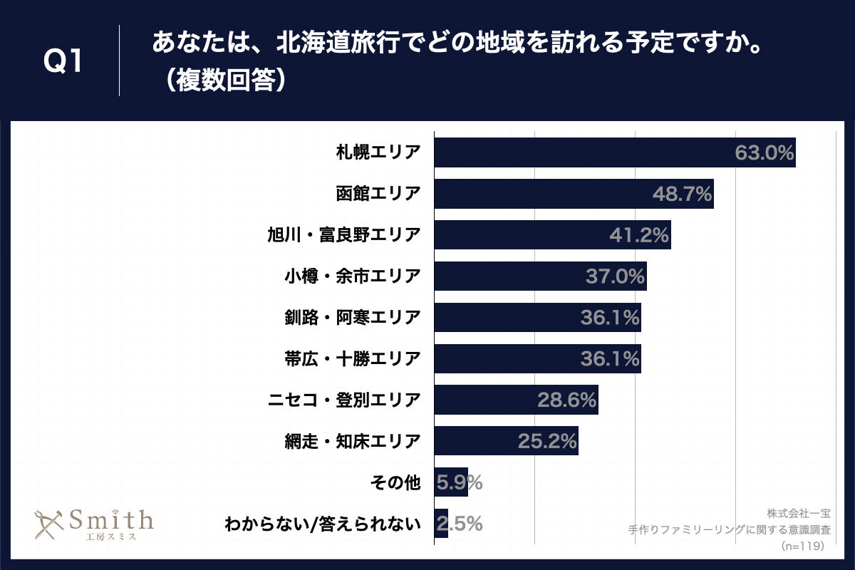 「Q1.あなたは、北海道旅行でどの地域を訪れる予定ですか。(複数回答)」(n=119)と質問したところ、「札幌エリア」が63.0%、「函館エリア」が48.7%、「旭川・富良野エリア」が41.2%という回答となりました。