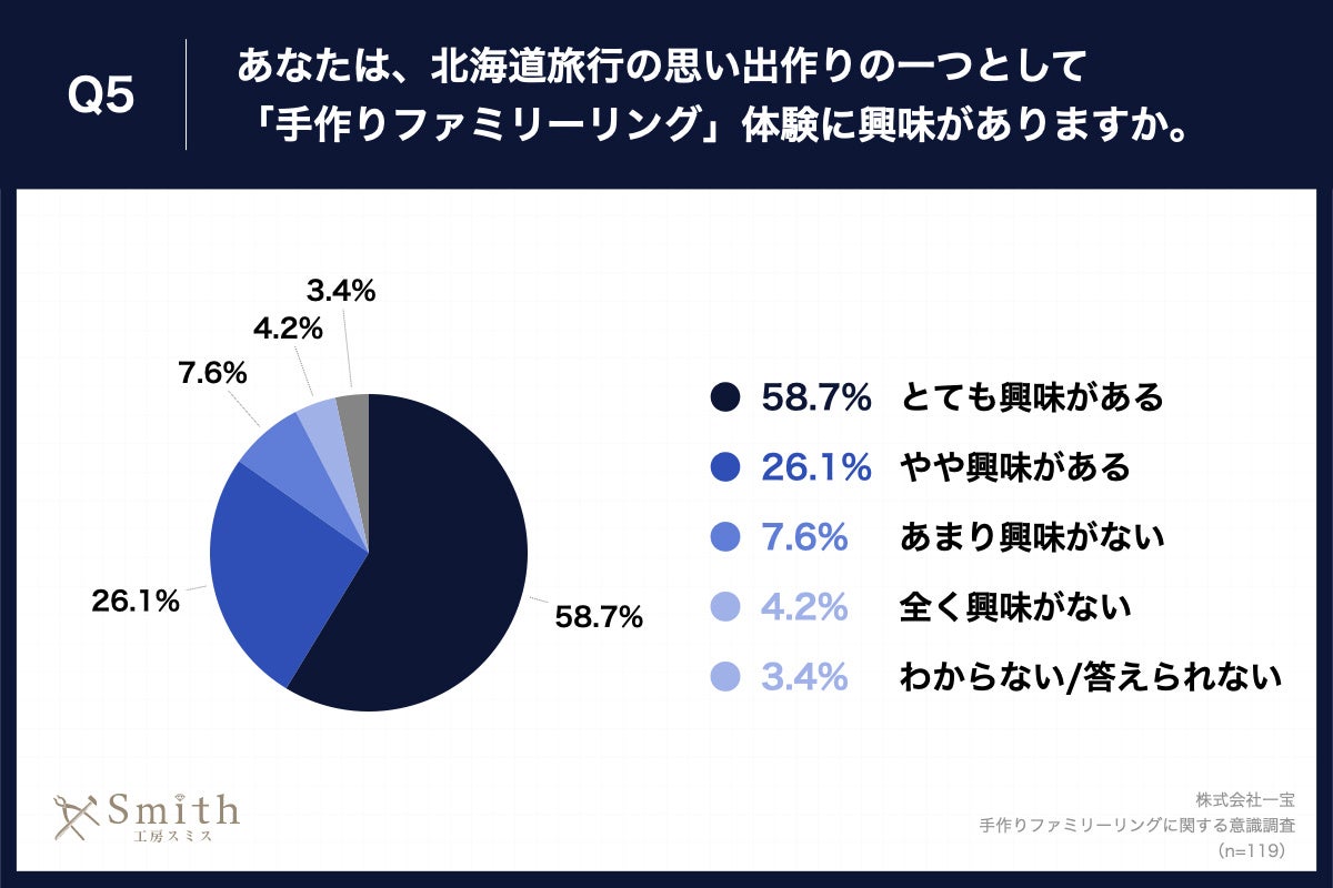 「Q5.あなたは、北海道旅行の思い出作りの一つとして「手作りファミリーリング」体験に興味がありますか。」(n=119)と質問したところ、「とても興味がある」が58.7%、「やや興味がある」が26.1%という回答となりました。