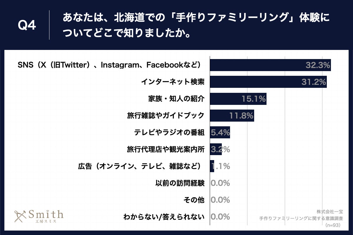 Q3で「はい」と回答した方に、「Q4.あなたは、北海道での「手作りファミリーリング」体験についてどこで知りましたか。」(n=93)と質問したところ、「SNS(X(旧Twitter)、Instagram、Facebookなど)」が32.3%、「インターネット検索」が31.2%、「家族・知人の紹介」が15.1%という回答となりました。