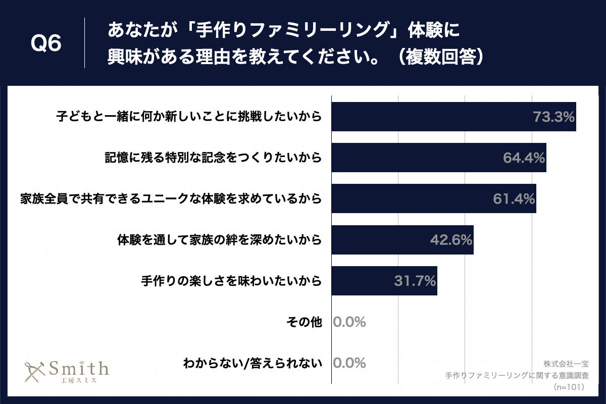 Q5で「とても興味がある」「やや興味がある」と回答した方に、「Q6.あなたが「手作りファミリーリング」体験に興味がある理由を教えてください。(複数回答)」(n=101)と質問したところ、「子どもと一緒に何か新しいことに挑戦したいから」が73.3%、「記憶に残る特別な記念をつくりたいから」が64.4%、「家族全員で共有できるユニークな体験を求めているから」が61.4%という回答となりました。