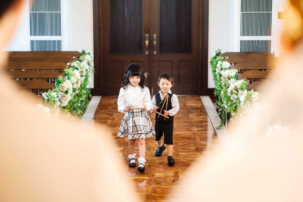 最近では、「リングボーイ」「リングガール」と呼ばれるキッズゲストが指輪を新郎新婦の元へ運んだり、指輪を運ぶ人をゲストの中からその場で決める「サプライズリング」のようなゲスト参加型の演出を取り入れたり、リングセレモニーの演出も多様化しています。