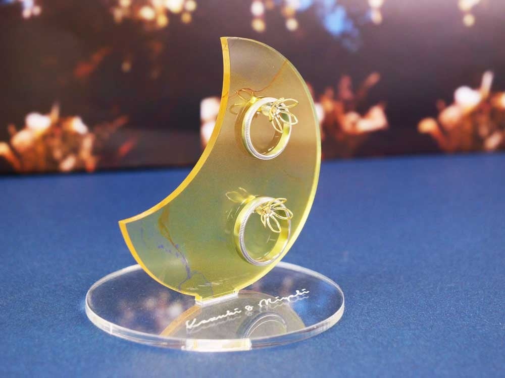 ファルベの《リングボード》《リングスタンド》には、お二人のお名前、挙式日を名入れしていただけるので、世界に一つだけのオリジナルリングホルダーをお作りいただけます。