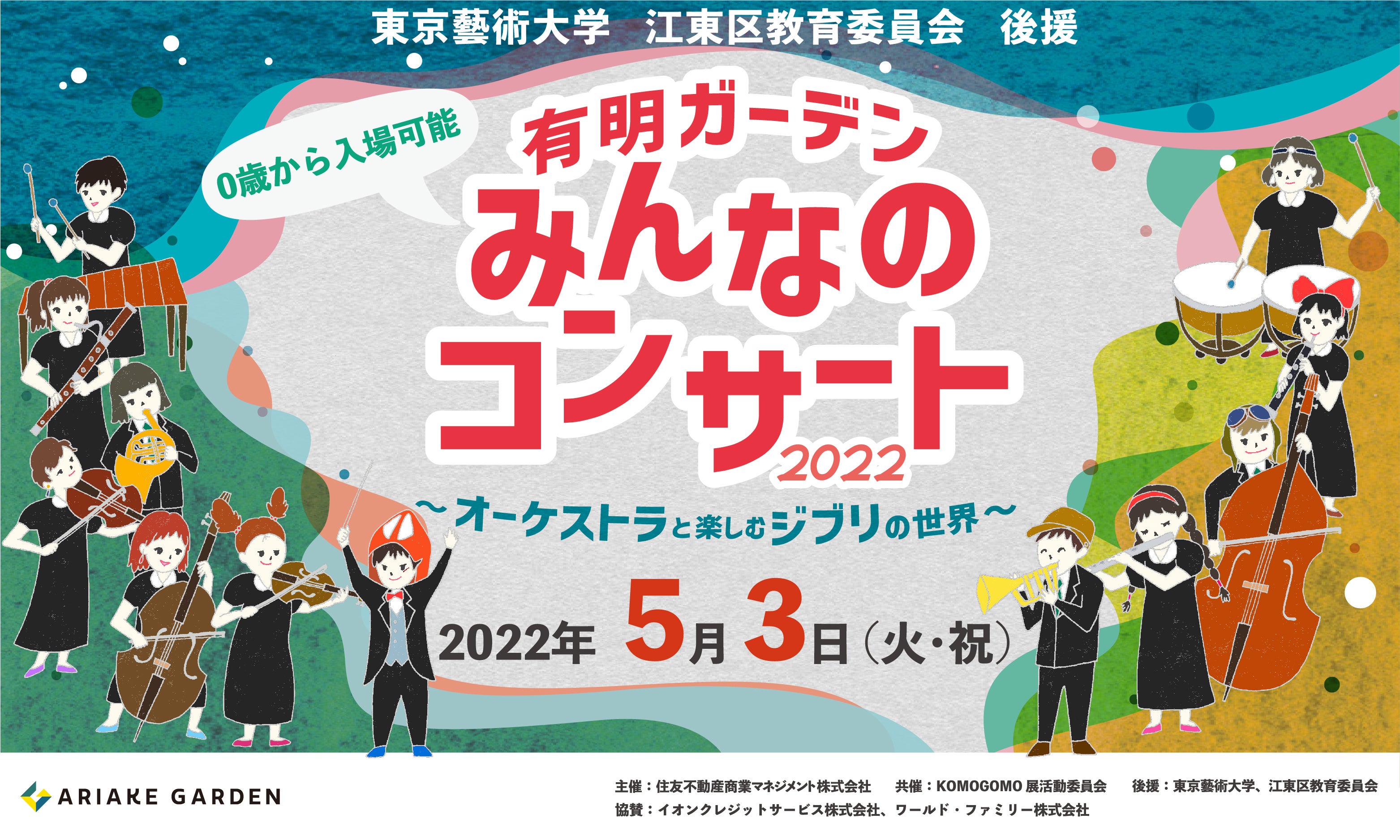 | 開催概要 イベント名:有明ガーデンみんなのコンサート2022 ~オーケストラと楽しむジブリの世界~ 日時:2022年5月3日(火・祝)16:00~(開場14:30) 場所:東京ガーデンシアター(東京都江東区有明2-1-6) 出演:東京藝大コモゴモ交響楽団 ※入場にはチケットのご購入が必要です。チケット料金や座席についてはこちらからご確認ください。 ▼チケットぴあ https://w.pia.jp/t/aricon2022/ |