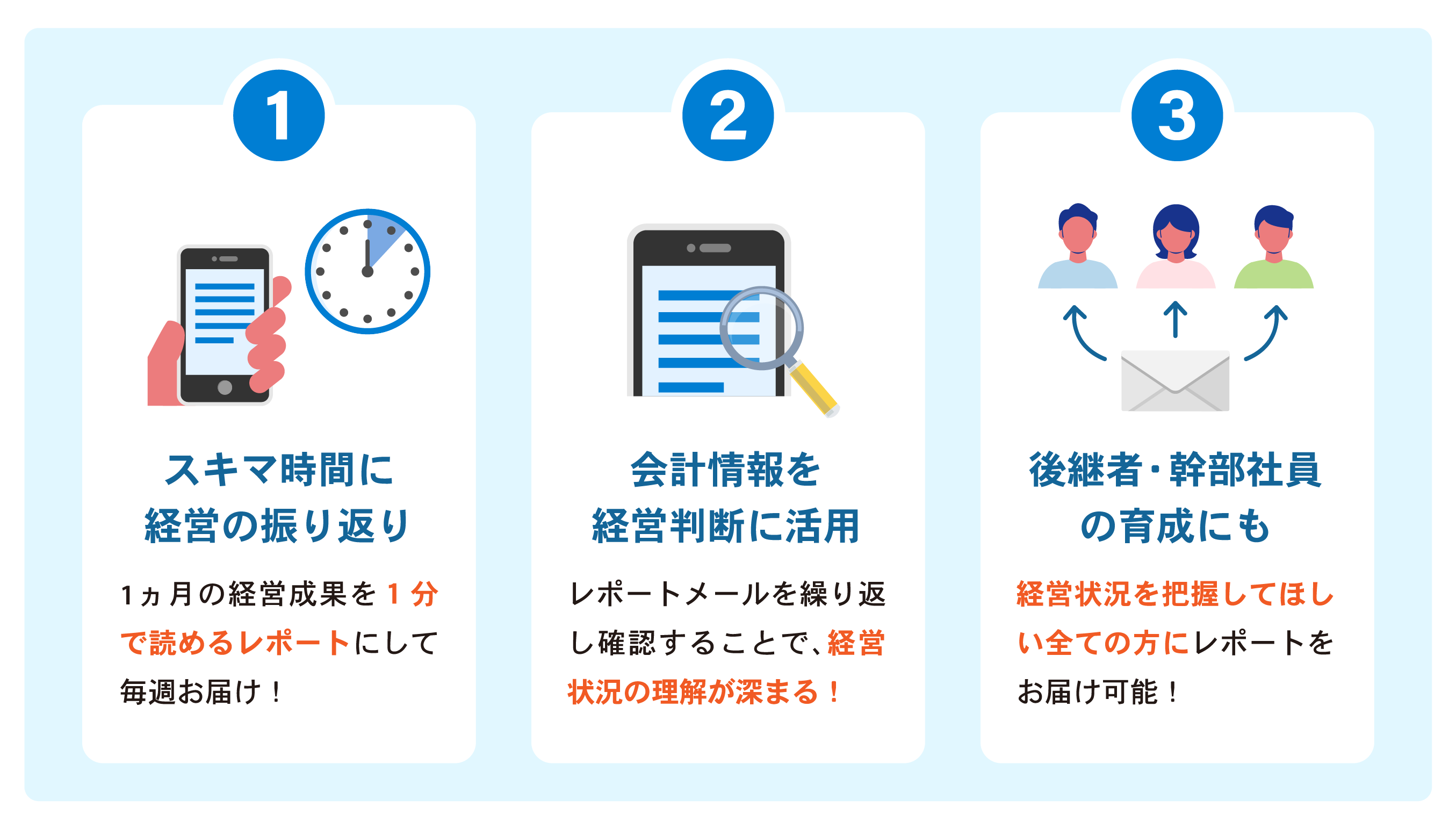 メールを受け取った顧問先はスキマ時間に経営を振り返ることができ、繰り返し経営成果を確認することで経営状況への理解が深まります。また、レポートは複数の方にお送りすることが可能となっており、後継者・幹部社員の育成にもお役立ていただけます。