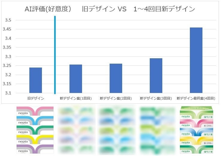 今回のデザイン開発では本AIを4回活用しました。1回目で旧デザインの課題抽出を行い、2回目で新デザイン6案を2案に絞り込み、3・4回目で新デザインが旧デザインより評価が高くなっているかどうかを確認しました。ブランドごとに「上質さ」「品質の高さ」を伝えること、ネピアのロゴ・商品名・品質コピーの視認性を高めることをデザイン開発の目標に設定。デザイン改良をするたびに、AI評価で確認し、改良方向を明確にすることで、開発期間の短縮化を実現しました。
