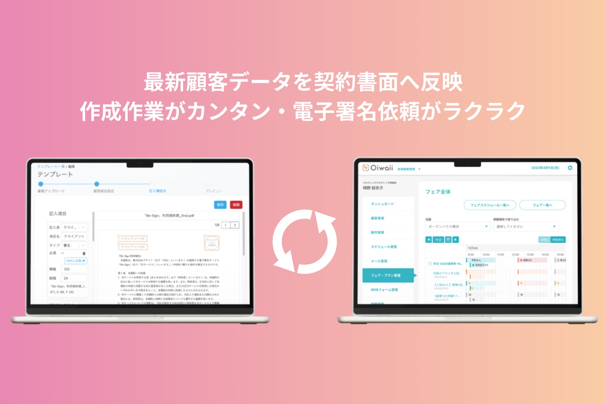 契約書作成・確認・承認がワンクリック!「Oiwaii」が管理する顧客情報と「Be-Sign」が管理する契約情報が連携し、スピーディーな顧客対応が可能になります
