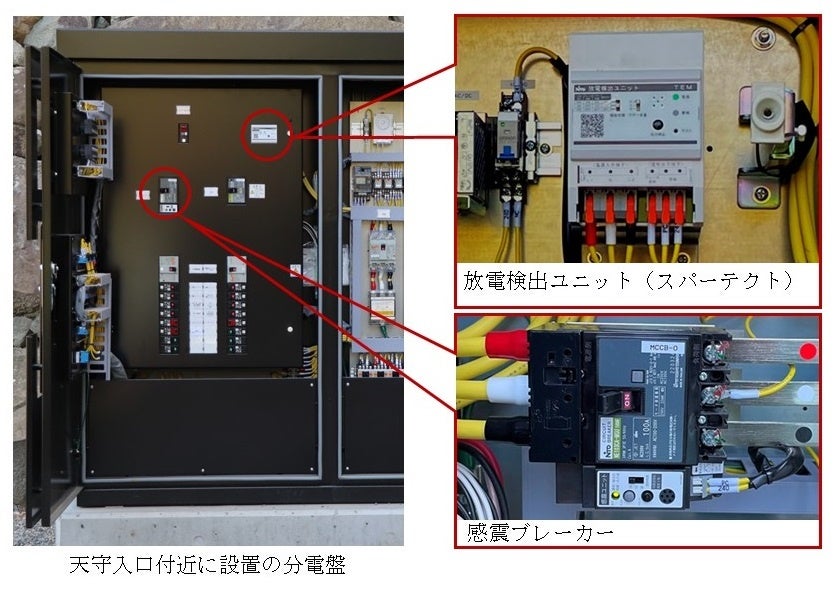 設置された場所は、天守に電気を供給する分電盤です。「放電検出ユニット(スパーテクト)」は、家屋内のトラッキングやケーブル断線、ショート(短絡)などで発生する火花放電を当社独自技術により検出し、電気火災を未然に防止する日本初の製品です。