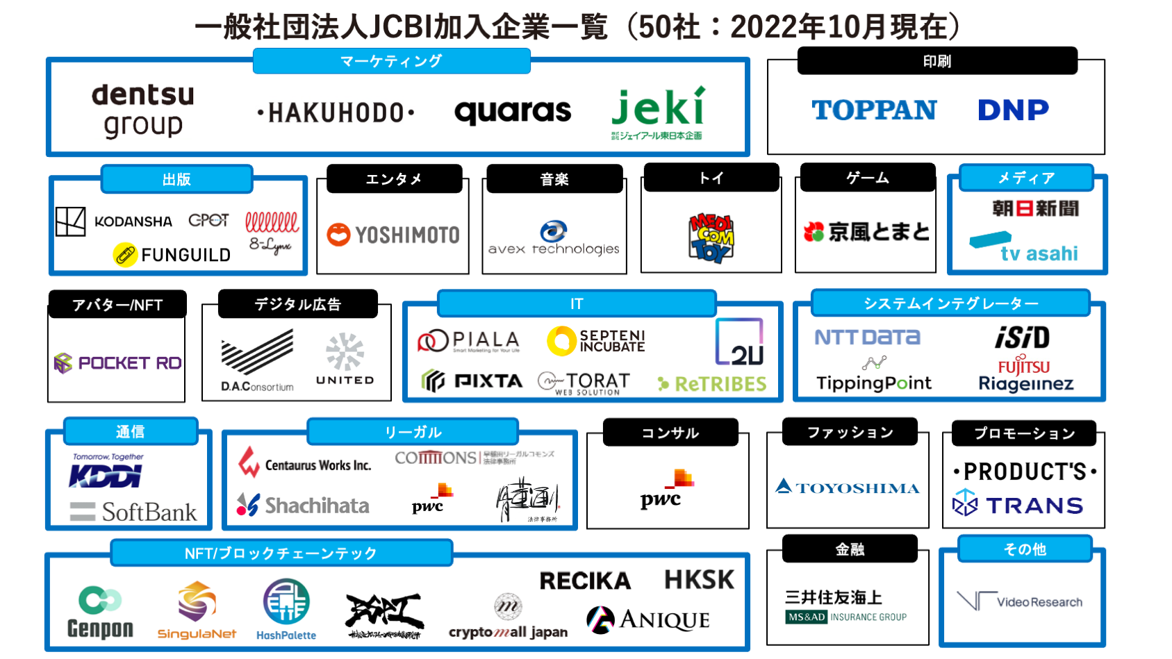 この度、5Gによる通信事業の進化と通信を核とした注力領域の拡大をパートナーと共に推進するKDDI株式会社、テレビ放送事業を中心としつつ音楽出版事業・インターネット事業・ショッピング事業・イベント事業等も展開する株式会社テレビ朝日、独自資産やノウハウを駆使して企業と生活者の新たなコミュニケーションを創造している株式会社ジェイアール東日本企画、テレビ視聴率をはじめとしたメディアデータ・消費者動向がわかるマーケティングデータなどの最先端のデータを提供して企業のマーケティング課題解決のトータルサポートを行うビデオリサーチ、著作権やメディア・コンテンツ分野の法領域を専門とする骨董通り法律事務所、世界約90カ国に3,600名以上の弁護士を擁するグローバルネットワークと協働して幅広い分野に対し法務サービスを提供するPwC弁護士法人、多種多様なジャンルの漫画コンテンツを手掛けて海外7か国で配信すると共に海外作品の輸入事業も積極的に展開して日本国外の多くの読者へ届けている株式会社ファンギルド、ライブ配信機能や月額課金メンバーシップ機能をベースとしたファンコミュニティ・配信プラットフォームサービスを提供する株式会社2U、WEBサイトの広告・宣伝・販売促進に関する企画やインフラ環境の構築・システム保守を行う株式会社ティッピングポイント、スマホのカメラを通じてNFTとARを掛け合わて拡張現実で楽しめるサービスを開発している株式会社HKSK、ITソリューションを通じて企業同士の出会いを生み出しビジネス機会を創出するビジネスマッチングサイトを運営するリトライブ株式会社が加わり、さらに加盟企業による共創を推進していくことで、一般社団法人JCBIは、メディア・コンテンツ業界全体のデジタルトランスフォーメーションを加速させていきます。