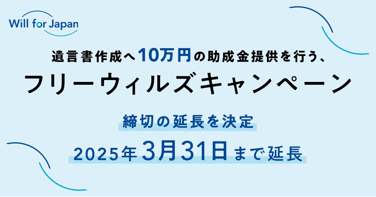遺言書作成へ10万円の助成金提供を行う、「フリーウィルズキャンペーン2024」締切の延長を決定