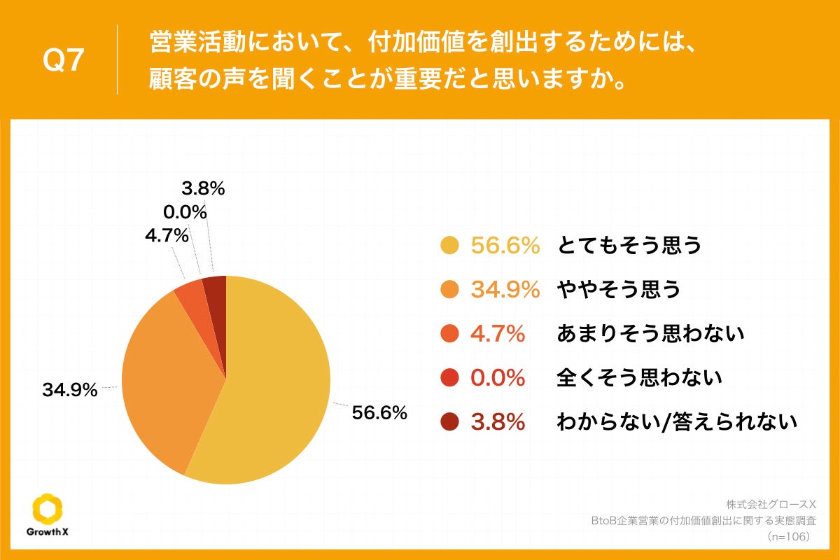 「Q7.営業活動において、付加価値を創出するためには、顧客の声を聞くことが重要だと思いますか。」(n=106)と質問したところ、「とてもそう思う」が56.6%、「ややそう思う」が34.9%という回答となりました。