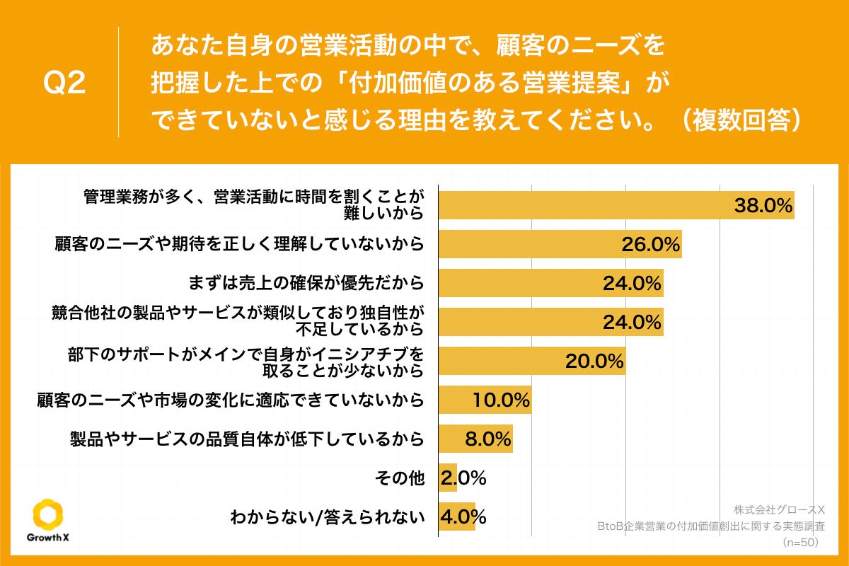 Q1で「レベル1」「レベル2」「レベル3」と回答した方に、「Q2.あなた自身の営業活動の中で、顧客のニーズを把握した上での「付加価値のある営業提案」ができていないと感じる理由を教えてください。(複数回答)」(n=50)と質問したところ、「管理業務が多く、営業活動に時間を割くことが難しいから」が38.0%、「顧客のニーズや期待を正しく理解していないから」が26.0%という回答となりました。