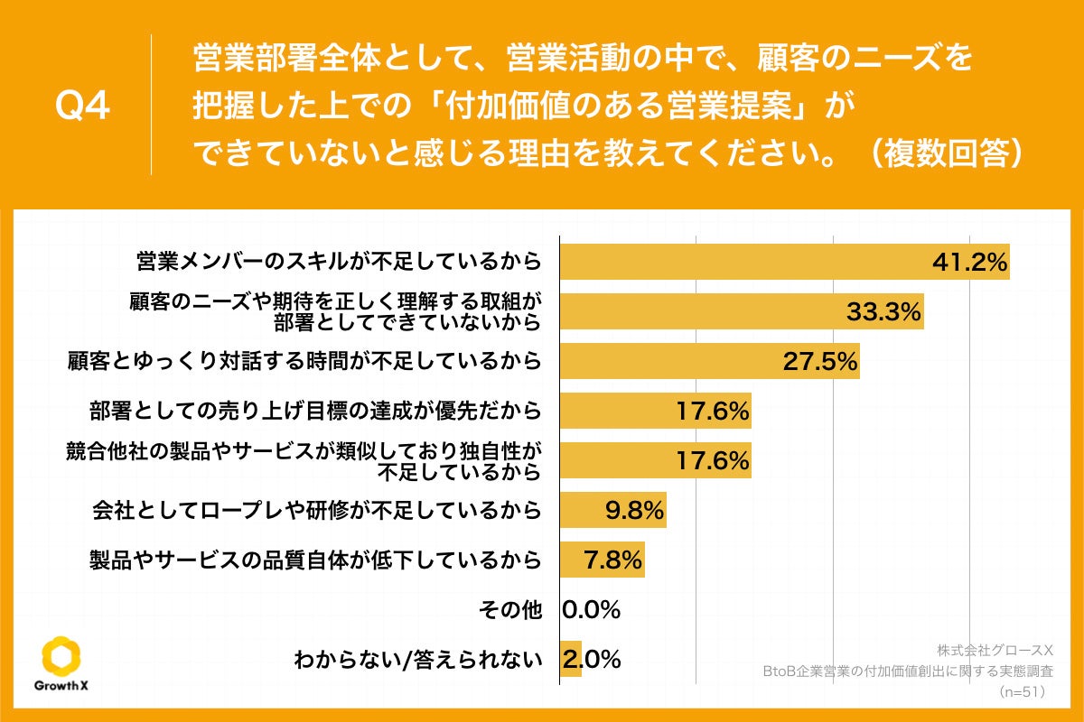 Q3で「レベル1」「レベル2」「レベル3」と回答した方に、「Q4.営業部署全体として、営業活動の中で、顧客のニーズを把握した上での「付加価値のある営業提案」ができていないと感じる理由を教えてください。(複数回答)」(n=51)と質問したところ、「営業メンバーのスキルが不足しているから」が41.2%、「顧客のニーズや期待を正しく理解する取組が部署としてできていないから」が33.3%、「顧客とゆっくり対話する時間が不足しているから」が27.5%という回答となりました。