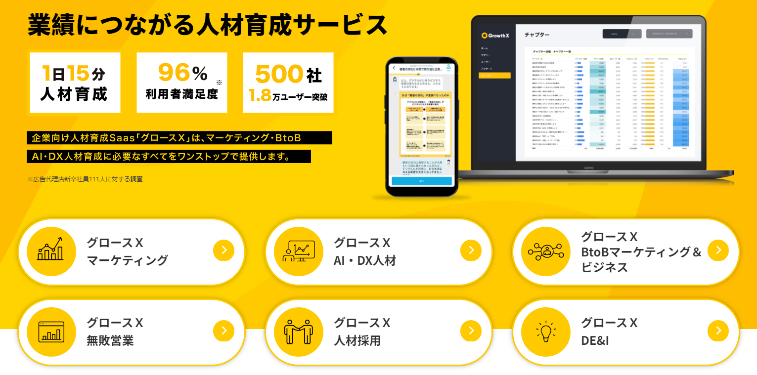 「グロースX BtoBマーケティング&ビジネス」は、BtoBビジネスに特化した人材育成サービスで、「価値」を生み、届けるチームを目指します。
