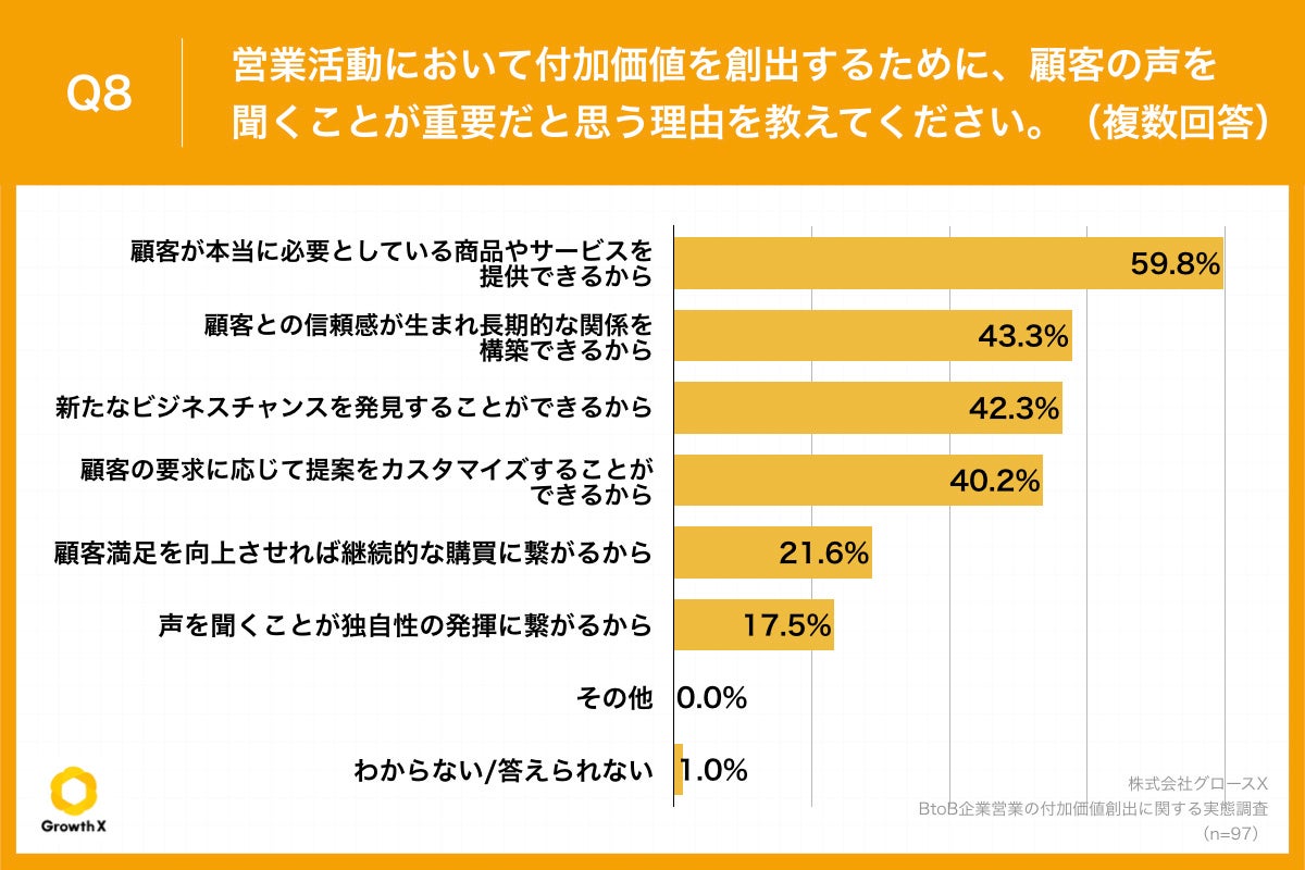 Q7で「とてもそう思う」「ややそう思う」と回答した方に、「Q8.営業活動において付加価値を創出するために、顧客の声を聞くことが重要だと思う理由を教えてください。(複数回答)」(n=97)と質問したところ、「顧客が本当に必要としている商品やサービスを提供できるから」が59.8%、「顧客との信頼感が生まれ長期的な関係を構築できるから」が43.3%、「新たなビジネスチャンスを発見することができるから」が42.3%という回答となりました。