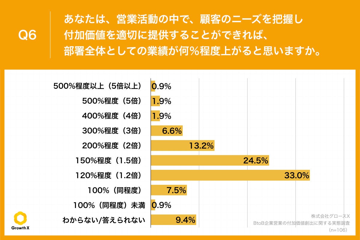 「Q6.あなたは、営業活動の中で、顧客のニーズを把握し付加価値を適切に提供することができれば、部署全体としての業績が何%程度上がると思いますか。」(n=106)と質問したところ、「120%程度(1.2倍)」が33.0%、「150%程度(1.5倍)」が24.5%という回答となりました。