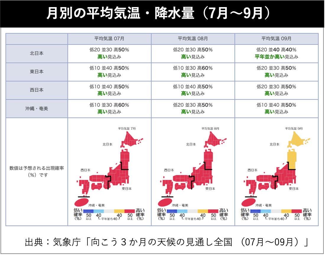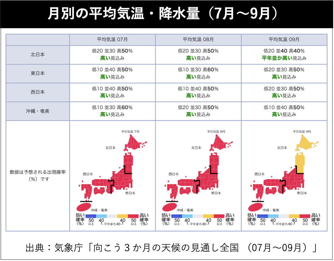 気象庁「向こう3か月の天候の見通し全国 (07月~09月)」https://www.data.jma.go.jp/cpd/longfcst/kaisetsu/?term=P3M
