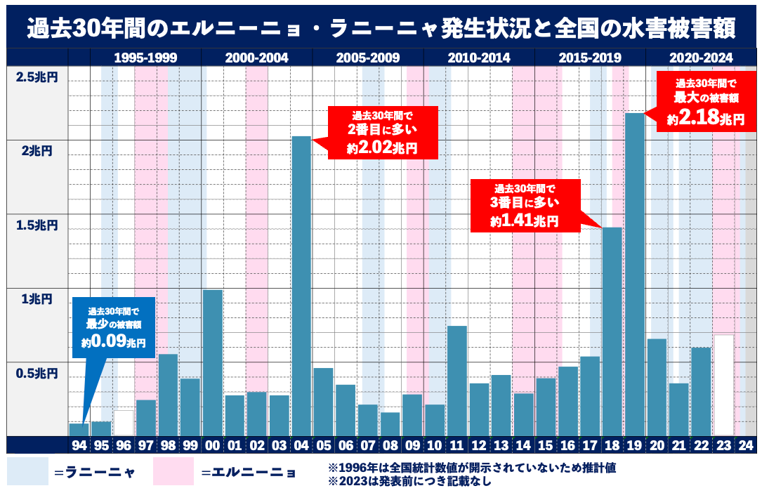 【2024年夏はラニーニャ現象が発生】ラニーニャ現象×豪雨災害×水害被害額の関係は!?過去30年間のエルニーニョ・ラニーニャ現象と気象予報士が2024年夏の気象予測を公開